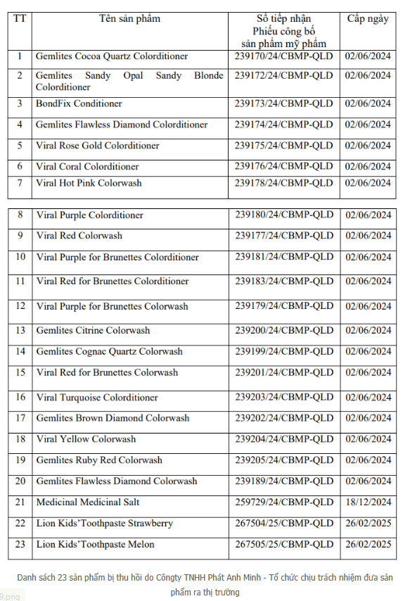Cùng ngày, cơ quan này ra quyết định đình chỉ lưu hành, thu hồi trên toàn quốc 23 sản phẩm của Công ty TNHH Phát Anh Minh ở Thanh Trì, Hà Nội.
