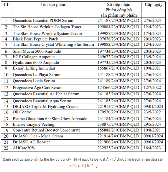 Theo đó, trong quyết định hôm 13/11, Cục Quản lý Dược quyết định đình chỉ lưu hành và thu hồi trên toàn quốc 22 loại mỹ phẩm của Công ty TNHH Quốc tế Đại Cát Á ở Phú Nhuận, TPHCM.