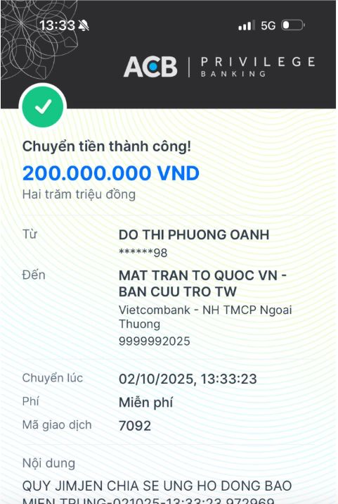 Trước đó, diễn viên Phương Oanh đã thông báo về việc ủng hộ 200 triệu đồng để hỗ trợ người dân miền Trung khắc phục hậu quả sau bão Bualoi. Nữ diễn viên chia sẻ dòng trạng thái trên cá nhân: “Chút yêu thương từ quỹ JimJen xin được chia sẻ cùng bà con!”.